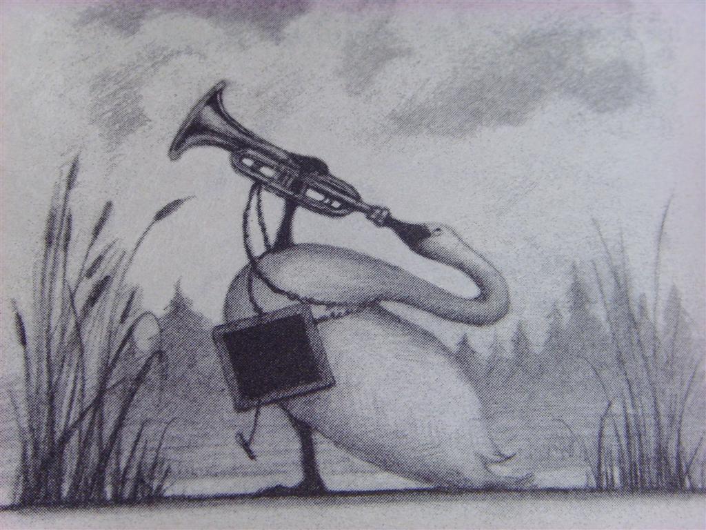 EB White (who wrote Charlotte's Web) wrote a book called "The Trumpet of the Swan" about a mute swan who actually learns to play the trumpet to win his love. It's awesome. louisthesw...99792e.jpg
