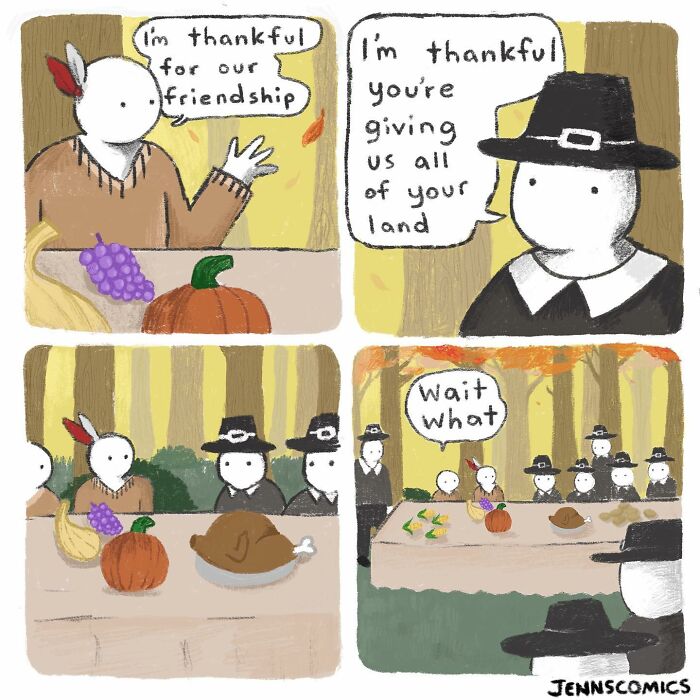 The fact that people think the first Thanksgiving was peaceful and the American Indians willingly did all these things for the Pilgrims makes me mad.