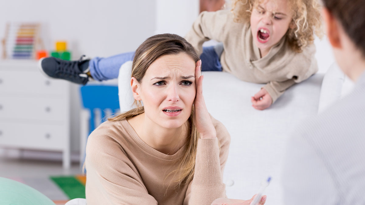 Stressed woman dealing with friend’s rowdy kids, deciding to host only childfree events in the future.