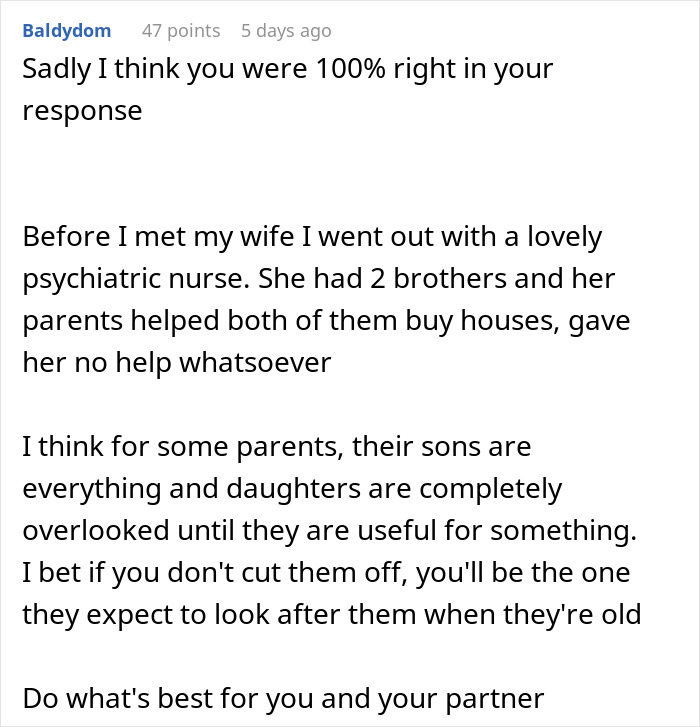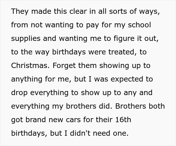 In the OP’s case, it’s unclear whether outsiders knew about the way she felt about her family members, or about the preferential treatment the parents gave to her brothers. However, other relatives were seemingly supportive of the OP and her wanting the wedding to be about her rather than her family members; people in the comments shared the same sentiment and wished the redditor a happy married life.