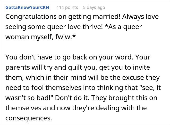 Load More Replies...It's your wedding it's your day it has nothing to do with anybody else and certain nothing to do with your parents and their spoiled man-baby sons. I was the oldest, from my mom's first marriage; I was always forgotten and ignored, and suffered emotional neglect as a child. Both my brothers were given cars when they were 18; parents paid for their tertiary education (I got a job and my employer paid for my tertiary education) Even to this day, she still worships her boys who can do absolutely no wrong. The irony is, both of them had juvenile criminal records and yet I was the black sheep of the family! I left home at 17 and never looked back.