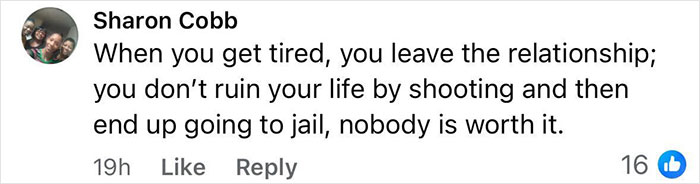 An additional commenter wrote, “She probably was tired mentally physically emotionally and got fed up with him. We don’t know what was going on in their house.”