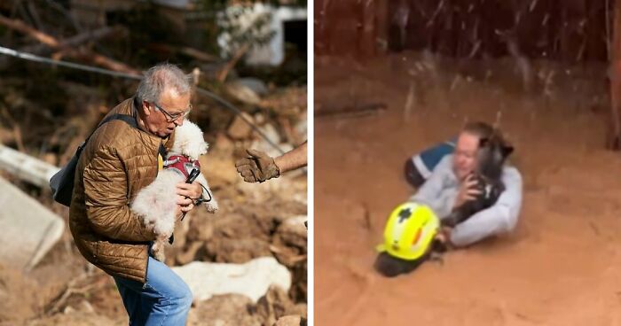 A daring woman holds on to her dog in neck-deep floodwater while waiting for a rescue helicopter during Spain’s historic floods