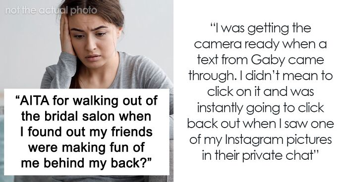 A woman took to the AITA online community to share how she accidentally discovered her pals had been saying mean things behind her back for a whole year. All this happened while she was fulfilling her bridesmaid duty and helping her friend select a wedding dress. She found the texts on the bride’s phone where she and the maid of honor were making fun of her.