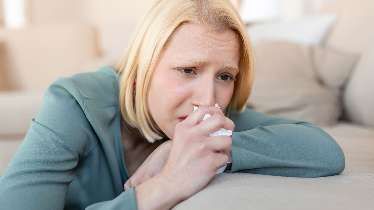 Woman upset on couch holding tissue, reflecting on a complicated 4-year-old relationship as mistress revelation unfolds.