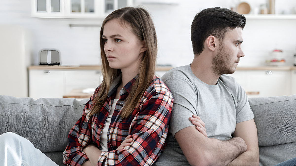 Young woman suggests an open relationship while the guy immediately breaks up, both sitting back-to-back looking upset.