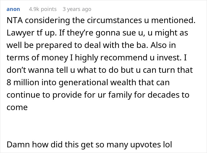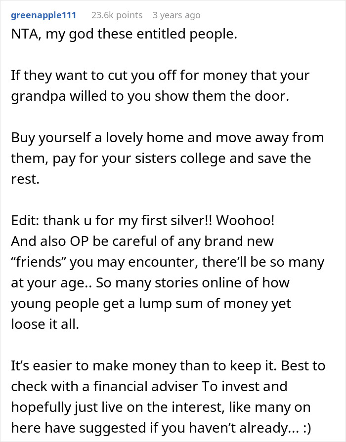 Load More Replies...You can have all the money or you can have your family. You cannot have both. I recommend trust funds for the family you want to keep. If you do one for your sister, then make sure she doesn’t have access to the principal (other than directly paid education expense) until she is 30. That means she will need to have a career and work. Giving an 18 year old access to a large sum of money is a recipe for disaster.