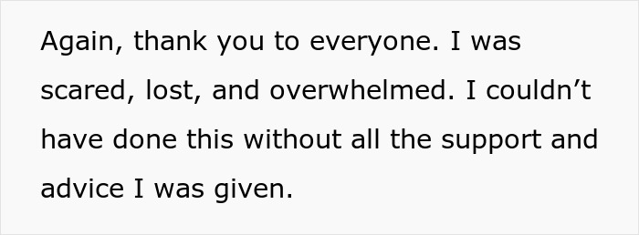The woman was incredibly grateful for all of the support and advice that the Reddit community gave her. “I was scared, lost, and overwhelmed. I couldn’t have done this without all the support and advice I was given,” she shared.