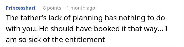 Load More Replies...OP is just trying to be as functional as possible at her destination, just leave her alone. I have chronic pain and swelling that flares up at altitude/on flights. The best way to manage it is to stay as still as possible. Getting up and down to let people pass, or getting bumped by people walking down the tiny aisles really aggregate things. This woman did the right thing, dad and flight attendant are jerks.