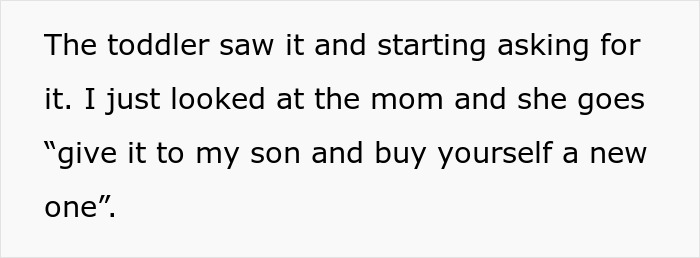 Had the mother asked the stranger with some kindness if she could go to the shop and get her child a similar treat that she’d pay for afterward, I’m sure the original poster (OP) would have complied and we would not be speaking about this at all. You’d be off looking at a list of cats or something… But that ain’t the case now, is it?