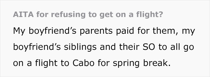 The Original Poster (OP) works in nursing and she took some time off to go on a vacation with her boyfriend’s family. It was spring break and the boyfriend’s parents paid for all of their children’s and their SOs’ flights and hotels for a trip to Cabo, a resort city in Mexico.