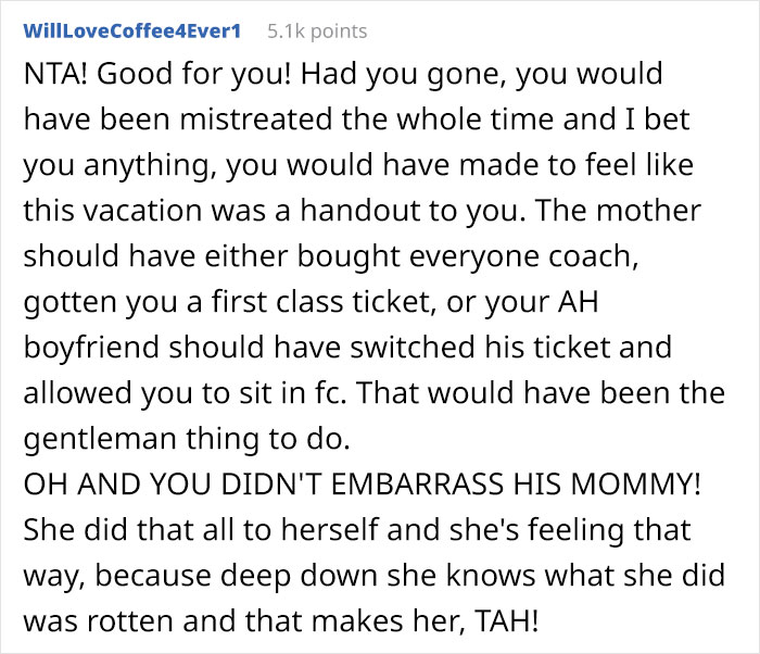 The boyfriend’s mom made an excuse saying that she had a free coach ticket so she wanted to use it as the OP must be used to flying like that anyway. Besides, she is going to Cabo for free and should be grateful to be able to do that in the first place.