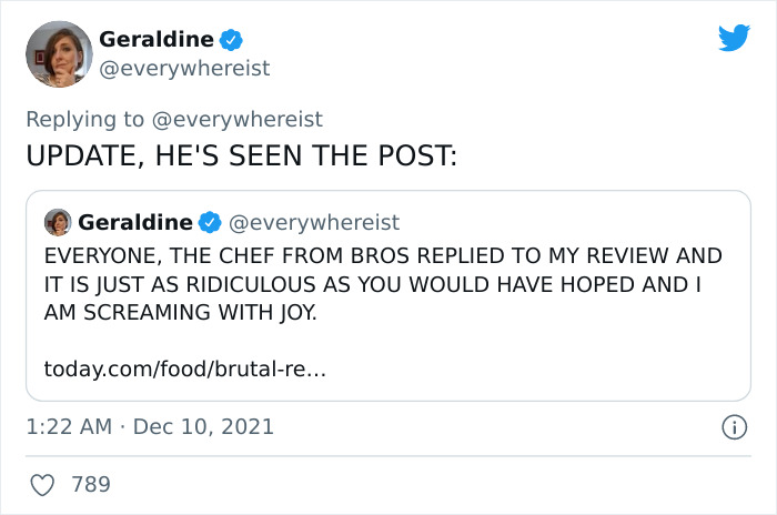 Naturally, the story was so good, it went viral on Twitter and beyond. It’s better than fiction and we hope you enjoy reading about it all as much as I did, dear Pandas. You’ll find Geraldine’s highlights from the awful meal for her social media below, but if you’d like to read the story in full, you can visit her blog right over here. Floriano Pellegrino, the chef at Bros’, later responded with a 3-page statement, likening his food to art.