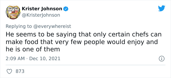 “I think that food can be so overworked and so far removed from its original source as to become pretentious, but when that happens fault obviously lies with the chef,” the writer said that the fault ultimately lies with the chef, not anyone else.