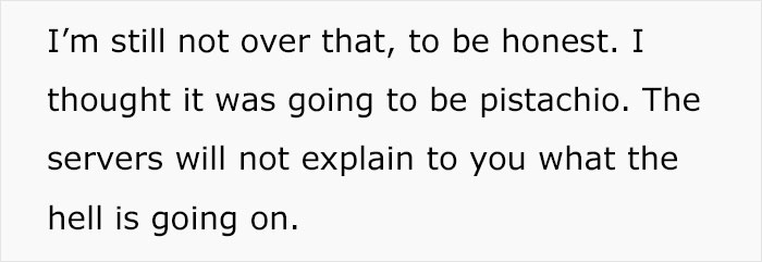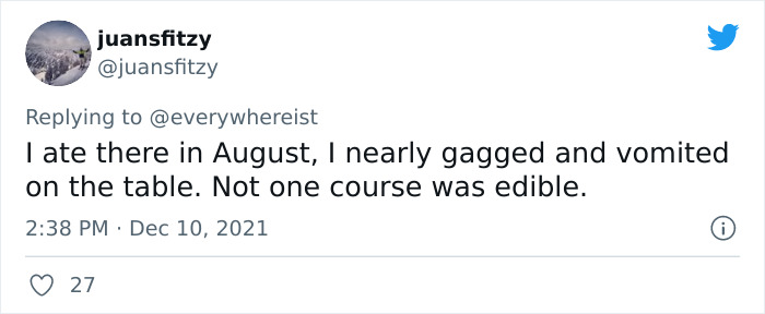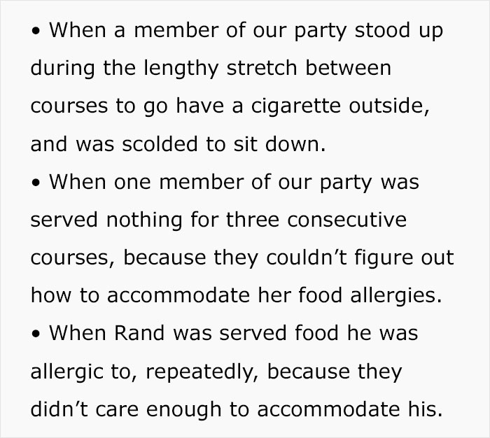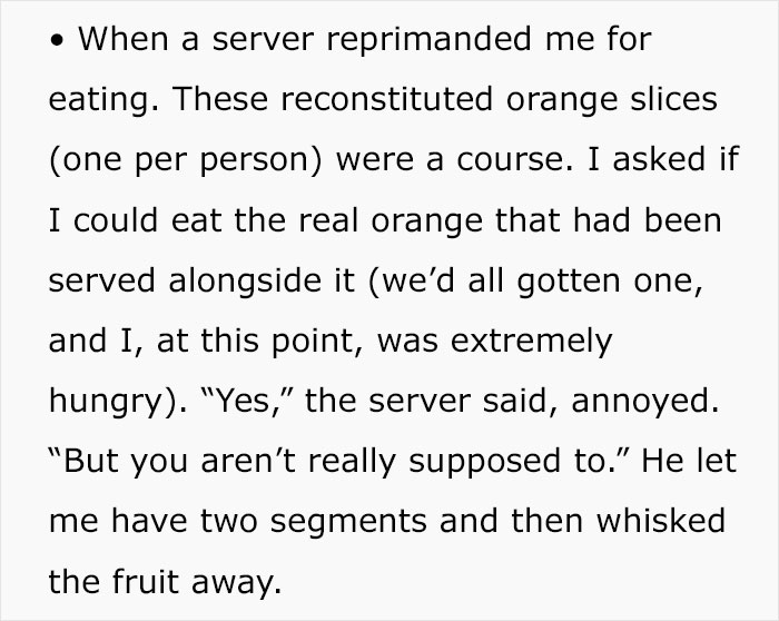 “If your lettuce was a little wilted because they spent so long arranging it artfully, or your ice-cream a bit melty by the time they added all the fancy toppings, keep the feedback constructive. If their ‘reverse spherification shrimp balls with oyster foam’ gave you food poisoning, feel free to let ’em have it!” she told Bored Panda.