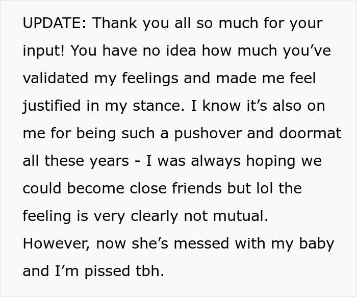 Jane decided to hand over the reins to her husband to handle his side of the family, making it clear that the pack-n-play was the final offer, if the in-laws still wanted to visit. She also insisted on an apology from her sister-in-law before she would feel comfortable hosting them: a bold and empowering move that Jane felt was long overdue, after accepting mistreatment by her sister-in-law for all those years. “I was always hoping we could become close friends, but the feeling is very clearly not mutual,” Jane recalls.