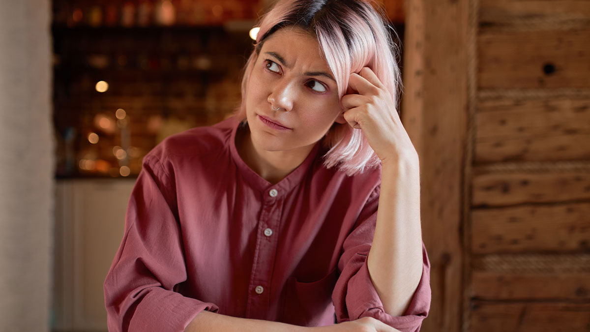 Young woman with pink hair in casual shirt looking thoughtful indoors, reflecting on spicy books causing a stir at a party.