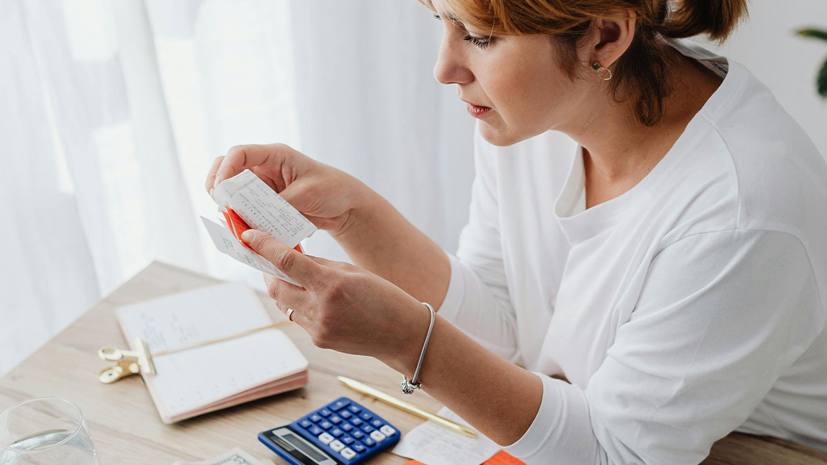 Woman managing budget and receipts at home, concerned about food expenses saved for their kids and relationship issues.