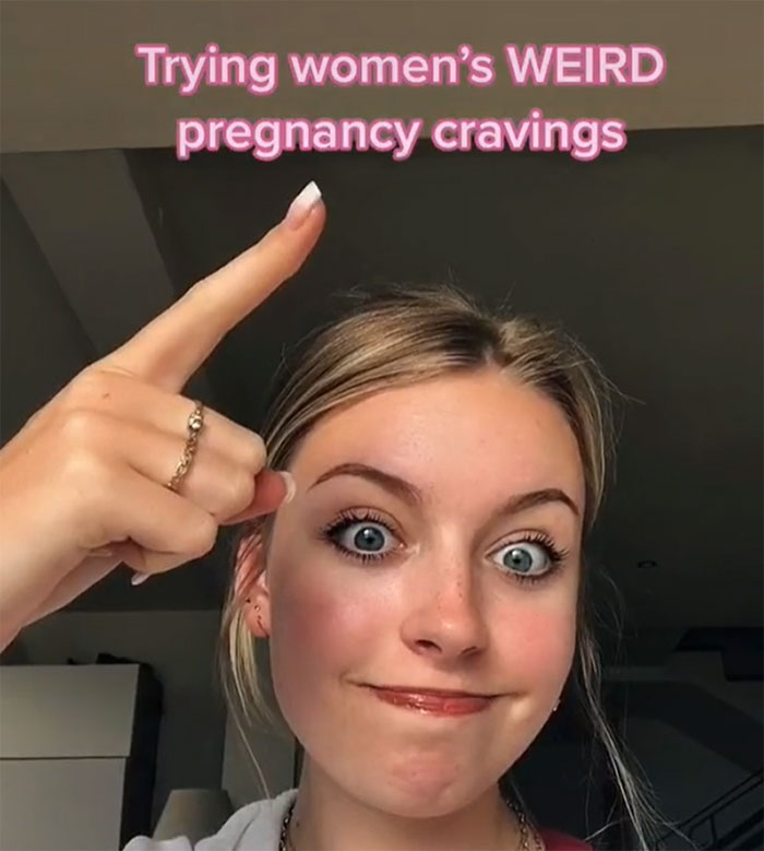 "As a content creator, I’m always searching for fun, original ideas/trends to bring to TikTok in order to entertain my audience. As I was scrolling through YouTube, I stumbled upon a video entitled 'testing women’s pregnancy cravings,'" Mia shared with Bored Panda how she decided to start making the videos about cravings herself.