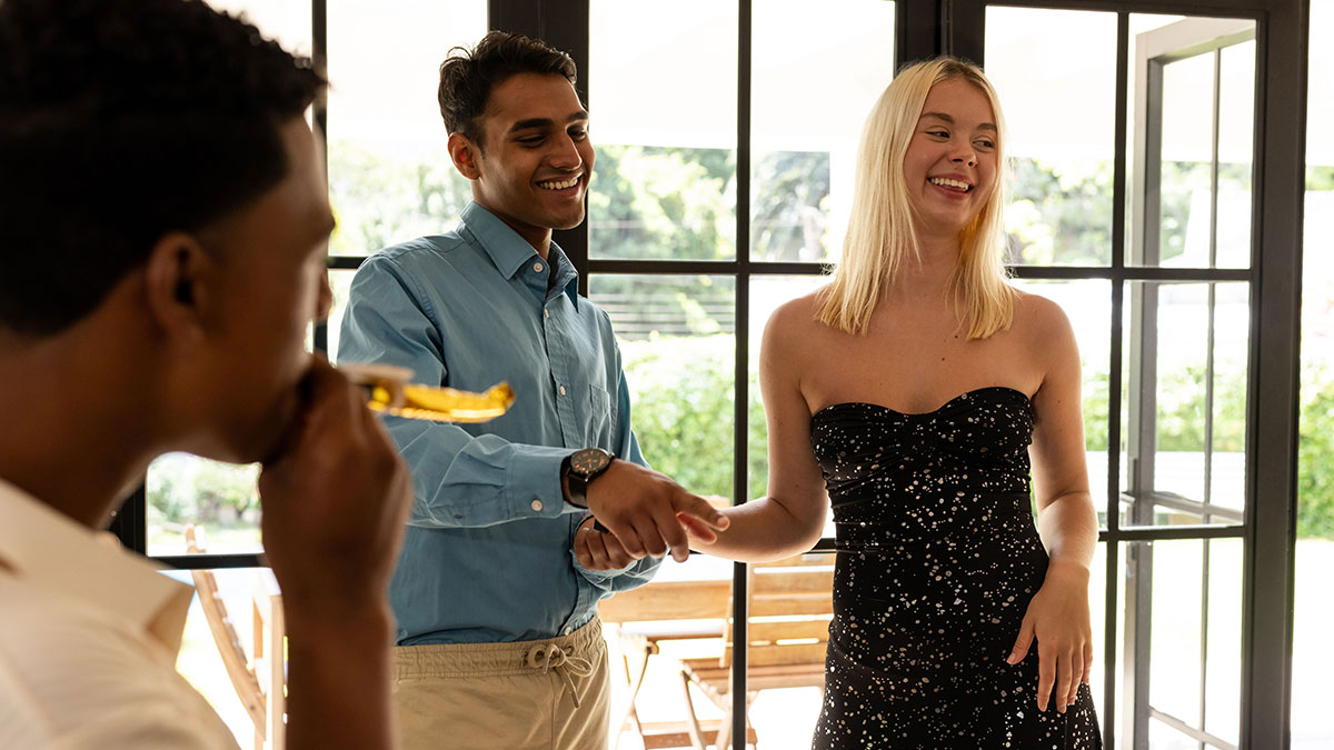 Young woman and man smiling and shaking hands at an engagement party, while another guest blows a party horn.