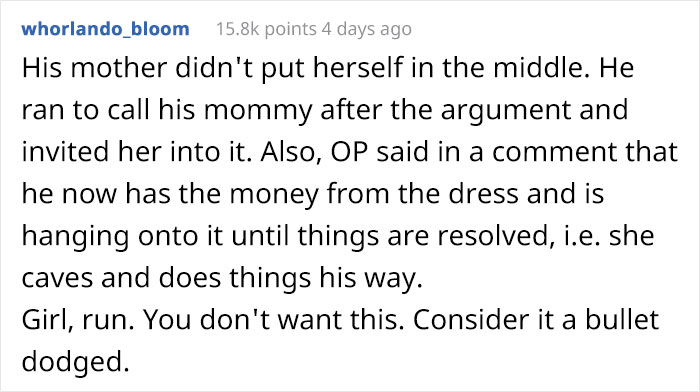 Load More Replies...It will only escalate from here. She needs to escape now! Make him think she'll rent a dress, get her money back, and go.