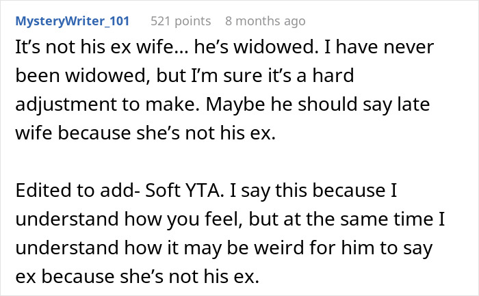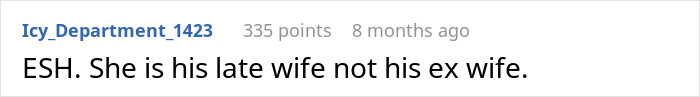 The dilemma this new family faced involved semantics. This woman got mad at her husband for referring to his late wife as his “wife” and not “ex-wife.” She worried that it was a sign of him not committing fully. So she decided to check with the Internet: was she a jerk for asking her husband to call his deceased wife his “ex-wife”?