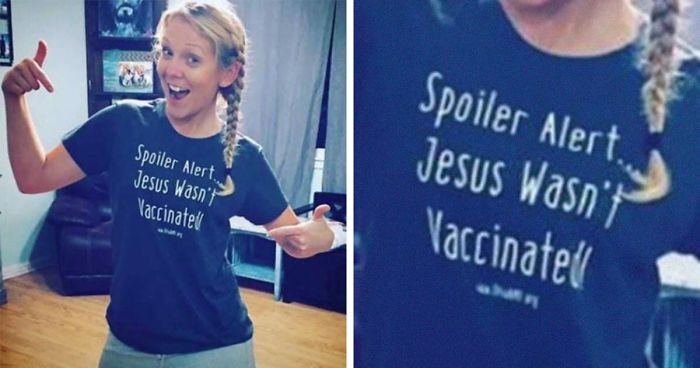 A photo of a woman wearing a T-shirt proclaiming ‘Spoiler Alert… Jesus Wasn’t Vaccinated’ got posted online. Can you imagine the reaction to this shamefully uneducated, funny slogan? Go on, and I’ll give you three guesses. That’s right, you guessed it in one – internet users mocked her and other anti-vaccination preachers relentlessly, with some incredible jokes being thrown about.