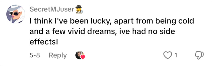 User comment about Mounjaro side effects, stating no side effects experienced except cold and vivid dreams.