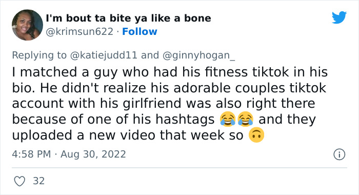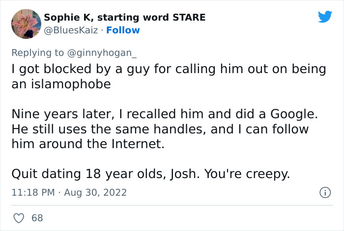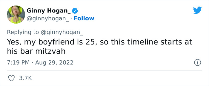 Others took Ginny’s tweet more seriously, like this one Tweeter, who pointed out that all that matters is that the boyfriend is with her right now—who cares about their romantic history prior to that? Another Tweeter speculated that it’s out of boredom and curiosity, sharing how his date was bored and dug out some skeletons from his closet.