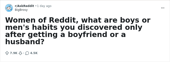 So when Reddit user BigBrosy asked women on the platform what they realized about men only after getting a boyfriend or a husband, thousands eagerly joined the conversation to share their observations.