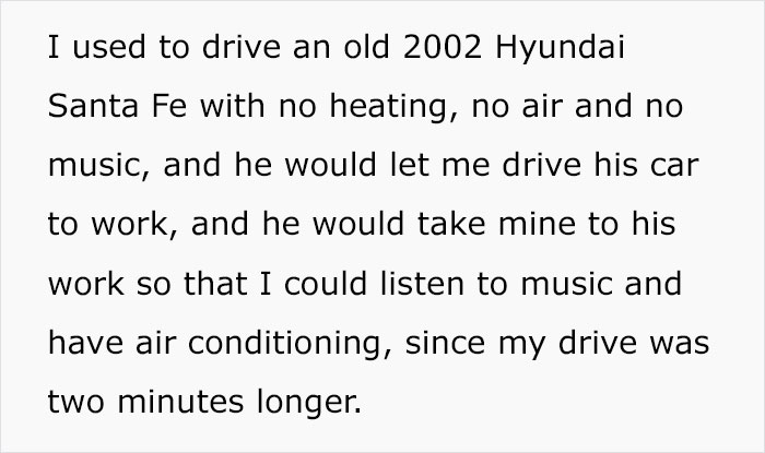 In the post, woman says her car has no heat,A/C or radio, so she drives his car...what the hell woman, why don't you fix your car?