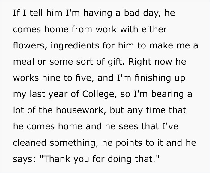 Load More Replies...His reactions whenever I have health problems, I can see he cares. He told me I could have one of his kidneys if it comes to this (and he was serious). When I was surprised by a literally debilitating migraine, he immediately helped me regain my senses, dressed me up, carried me to the car (we live on the 4th floor of an apartment building with no lift, and I'm 178cm of height) and drove me to the hospital. Years ago, when we were students, when we first moved home together, his priority was to make sure the place was heated well to keep me warm. I could go on and on.