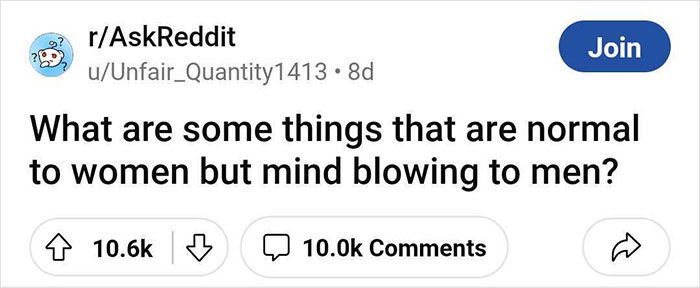 Interested in everyday examples, Reddit user Unfair_Quantity1413 made a post on the platform, asking everyone "What are some things that are normal to women but mind-blowing to men?" Here are some of the most popular answers they have received.