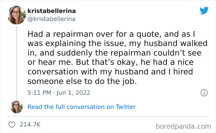 Recently, writer, politico, and mom Krista Pacion from Arizona, USA, tweeted about an experience she had with a repairman who started ignoring her the second her husband walked into the room, and it inspired other women to share all the similar situations they've had the displeasure of being in themselves.