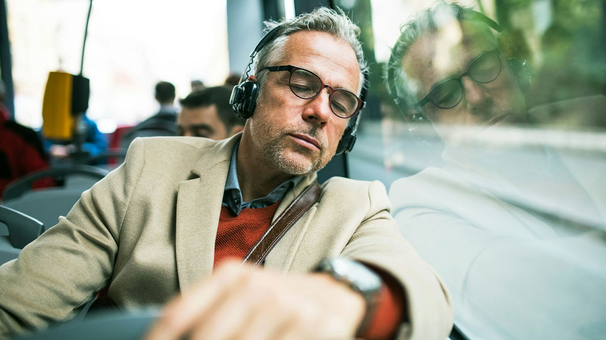 Man wearing glasses and headphones resting peacefully on a bus, illustrating men living in peaceful bliss. When I rode the bus regularly I never thought twice about sleeping on it. Mentioned it to a female friend and she was all "you do what now!?!?!".