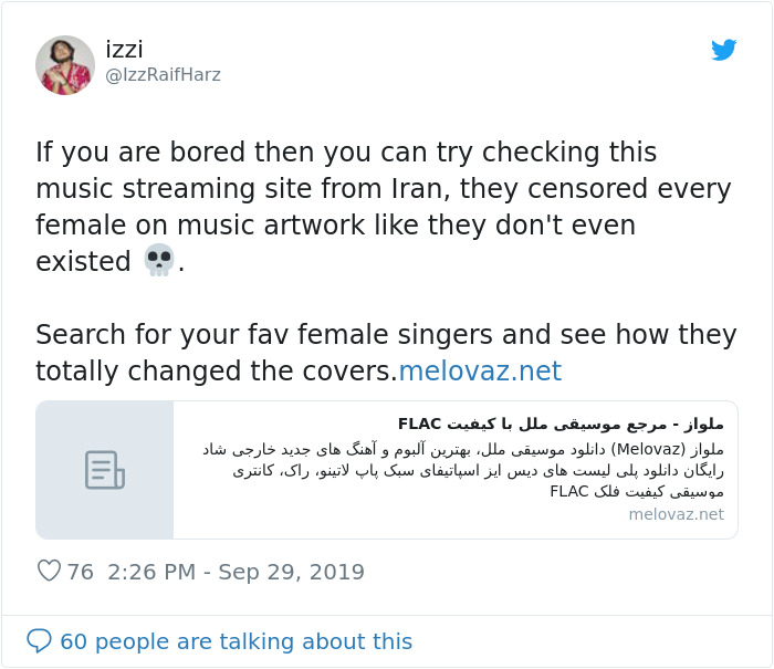 Load More Replies...As Iranian girl who lives there, I'd like to mention that according to strange law here listening to female singers is banned and this site is doing illegal and this sort of censorship is a weak try for ditching authorities. by the way 90 percent of people here don't like this kind of rules and don't listen to the government. this actually happened after 1979 Revolution in Iran before that time we had a free country like yours.