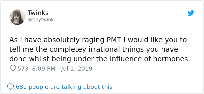Twitter user "Twinks" decided to share her story recently and asked others to do the same. “What completely irrational things you have done while being under the influence of hormones?” The responses are both painfully relatable and rather funny.