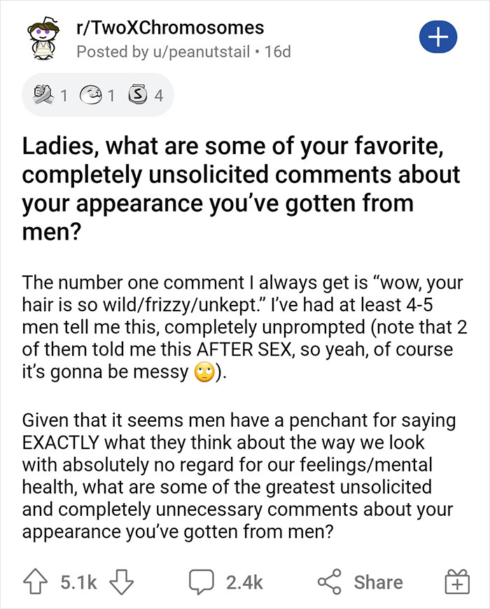 We reached out to the author of this post, peanutstail, to talk about how it feels to receive unasked-for comments and why do some men say them in the first place. The user got the idea for this thread after going to a club with a friend: “A guy I was chatting with randomly telling me it looked like I ‘didn’t take very good care of my hair,’ she told Bored Panda.