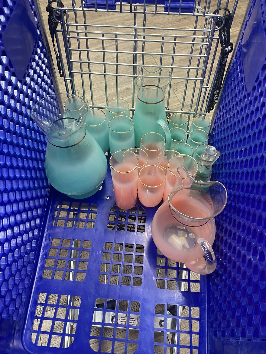 I walked into goodwill to see these on the shelf. It’s 3 different sets of Blendo pitchers and glasses!!! The pitchers were $1.99 each and the glasses were 99 cents each. All 3 sets came up to be $25 with tax.