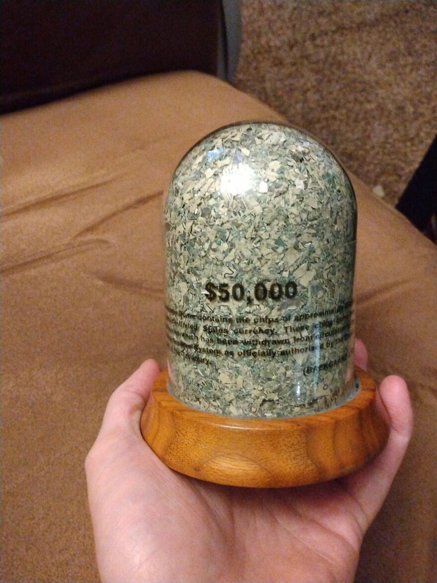 Text reads, "$50,000- this money dome contains the chips of approximately $50,000 in genuine united states currency. These chips come from legal tender which has been withdrawn from circulation by the federal reserve system as officially authorized by the department of the treasury." bought this for $2.99 at the Tukwila, WA goodwill.