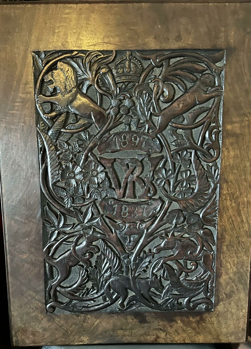 Just went by our local auction house, found this piece that didn’t sell in a previous auction so made a cheeky offer and it was accepted! It is a whopping piece of solid mahogany, carved with queen Victoria’s royal cypher and dated 1837/1897, it is a commemorative piece for her diamond jubilee, with carvings to represent the U.K.