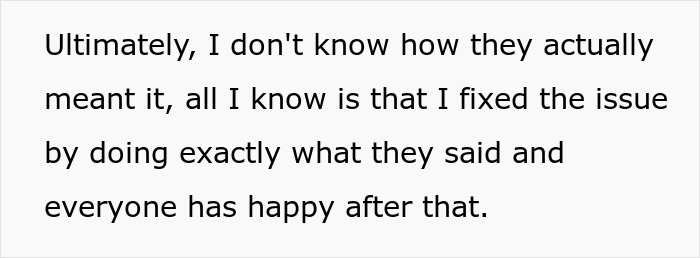 What follows is one solid happy ending. The higher-ups, as promised, never again received HR reports on the original poster’s work schedule, regularly praised them for good results, and in one of their personal conversations with a colleague many months later, that guy suggested that the boss did not mean exactly what the author did. To this, however, the OP had their own answer – wide-open surprised eyes and demonstrative confidence that they had done everything right. Well, this kind of policy has brought success to many people long before the original poster, and will bring it to many more people long after them…