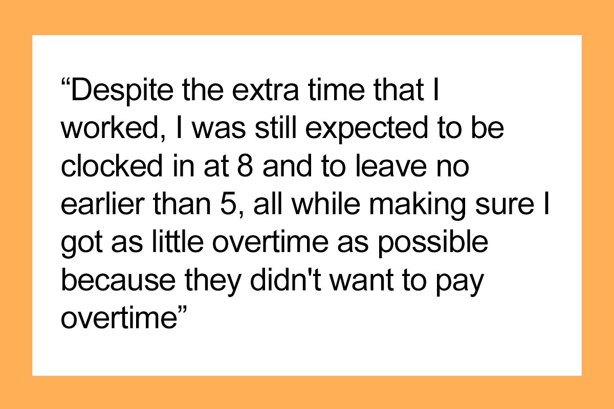 The whole problem was that the author of the post was hourly but should have been salary, and moreover, the specifics of their work implied having to work odd hours. However, the employee, like all their colleagues, was expected to clock in at 8am, leave at no less than 5pm, and have their lunch at a pre-defined time, despite the very nature of their work meaning that the schedule should definitely be flexible.