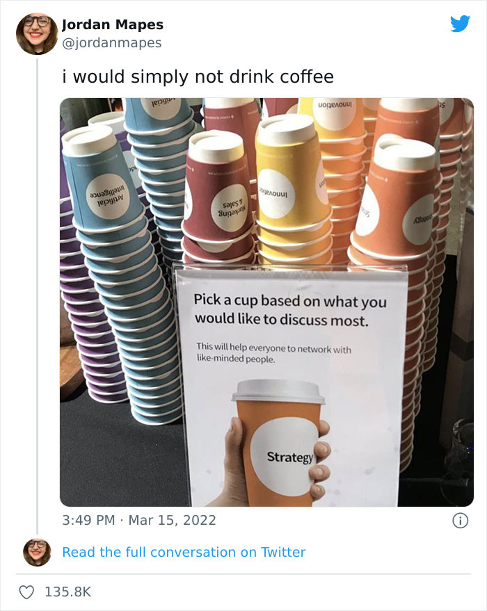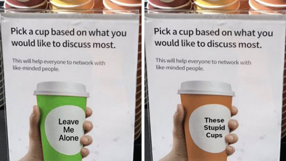 There's nothing more distressing than having to socialize with professional folks during some work conference, let alone being forced to choose a labelled cup to encourage a conversation in an already awkward environment. Besides, it seems that the original poster is also not a fan of this particular method, as Mapes wrote that she'd simply rather withhold from drinking the coffee.