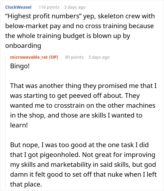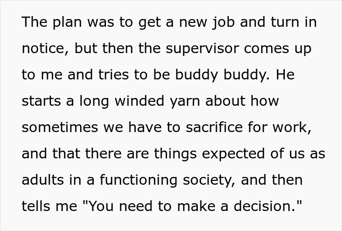 The OP decided not to stay in such a role, either, which is something fellow netizens in the comments applauded them for. “If you always put the needs of others before yourself, you teach the world that you’ll never put yourself first. The world won’t do it for you; you have to do it yourself,” the redditor told Bored Panda. “An employer worth working for will understand and respect you taking care of yourself; it only makes you a better employee if you’re happy with things that aren’t work-related.