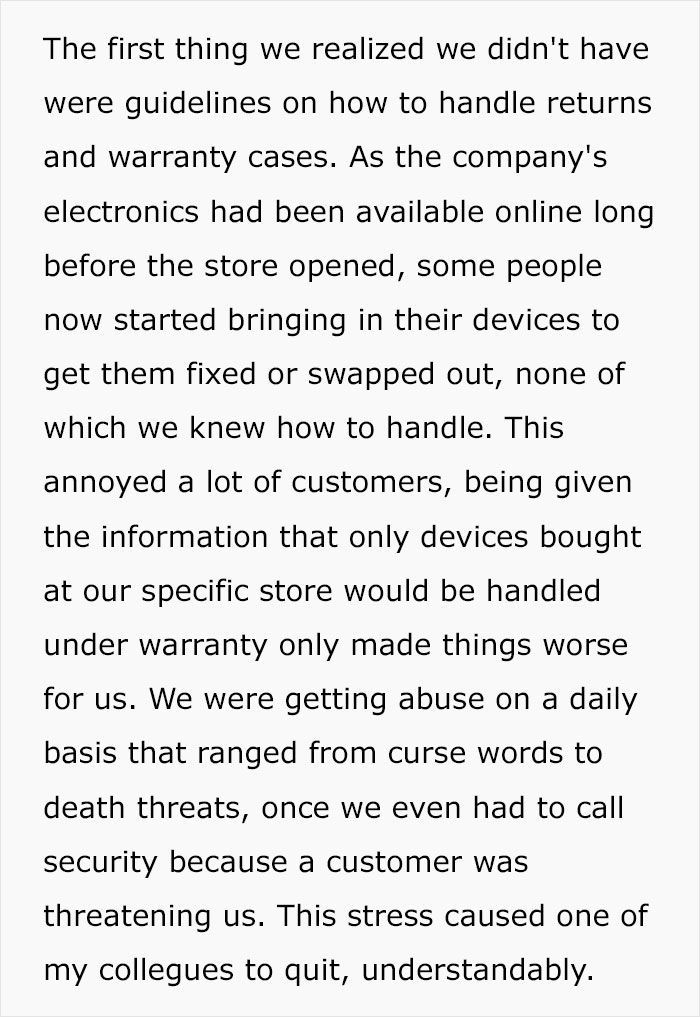 Immediately, there were problems. The first thing they understood was they had no clue how to handle returns and warranty cases. Until that point, all sales had been done without a storefront. Now that there was one, folks started bringing in their electronics despite buying them not from the store. And a decision was made to not accept them. Which angered a lot of people. To a degree where they started making the store’s employees’ lives difficult.