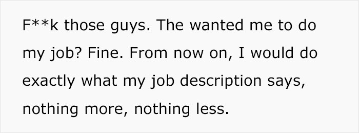 Not 30 minutes later, boss-man showed up, demands an explanation. OP maliciously complied, explaining what he was not doing and why he was not doing it. Because he wasn’t the manager, he was being paid half of what the previous one got. So who was supposed to do the work now? OP did offer his services for double what the previous manager earned, but the boss literally laughed in his face. OK then, good-bye!