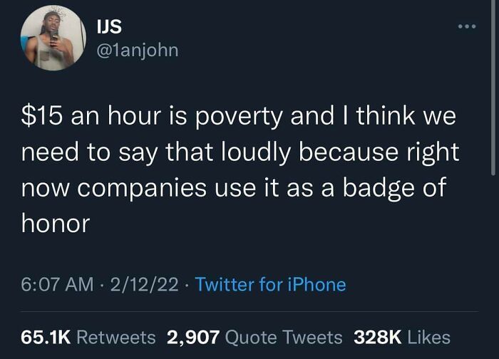 Our financial system is f****d up. Like, how are we supposed purchase necessities if we make $2 an hour with 90% of it going to taxes and bills? And they wonder why the homeless population is getting bigger. Minimum wage should be raised to an actual wage we can LIVE off of. People still live with their parents because the system isn't giving them enough to live. I say tax the s**t out of the billionaires. They've got enough money just laying around. And inflation isn't making things any better. Workers wages stay the same while the price of goods go up making it even more impossible to live. Even if you get like $25000 or more a year, most of it is going to fixed expenses like bills and taxes so you have $11 to go buy this week's groceries. The middle class is shrinking because we're all losing money while billionaires are getting richer. This concludes my TED Talk. (yes I know a lot of this is an exaggeration but it helps me express how f****d up this is)