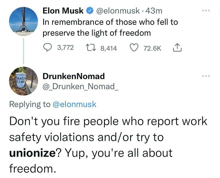 No Elon is not about freedom just his own brand of censorship. He censored a guy just because he didn't like him and even admitted it. Which hey it's his company his right to do it, but don't go around pretending to be about free speech.