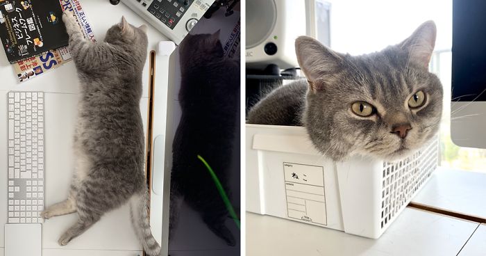 Komori simply placed a small plastic box on his desk. After a short sniffing session, Kakka got himself into the box and his owner gently slid him to the side of his computer screen. “You can also move it to the corner of the desk with it stored,” the caption below the second video that Komori shared, read. “In this way, you can use the desk spaciously.” The ingenious solution not only makes Komori’s workday a bit easier since Kakka isn’t trying to seize the desk, but it’s also fun for the cat who, like all cats, is known for being an avid lover of boxes.